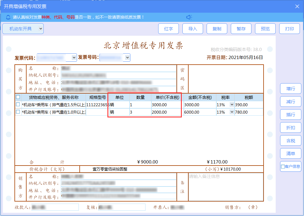 l 开具机动车专用发票时,商品行的“单位”、“数量”和“单价”栏不能为空,且单位必须是“辆”,数量必须是整数。