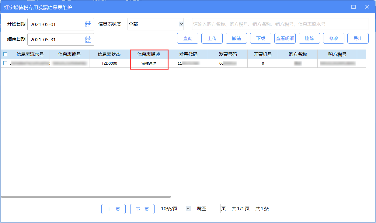 【第九步】选择信息表,点击“上传”按钮,局端返回“审核通过”,如图27所示。该张信息表可以用来开具红字机动车专用发票。