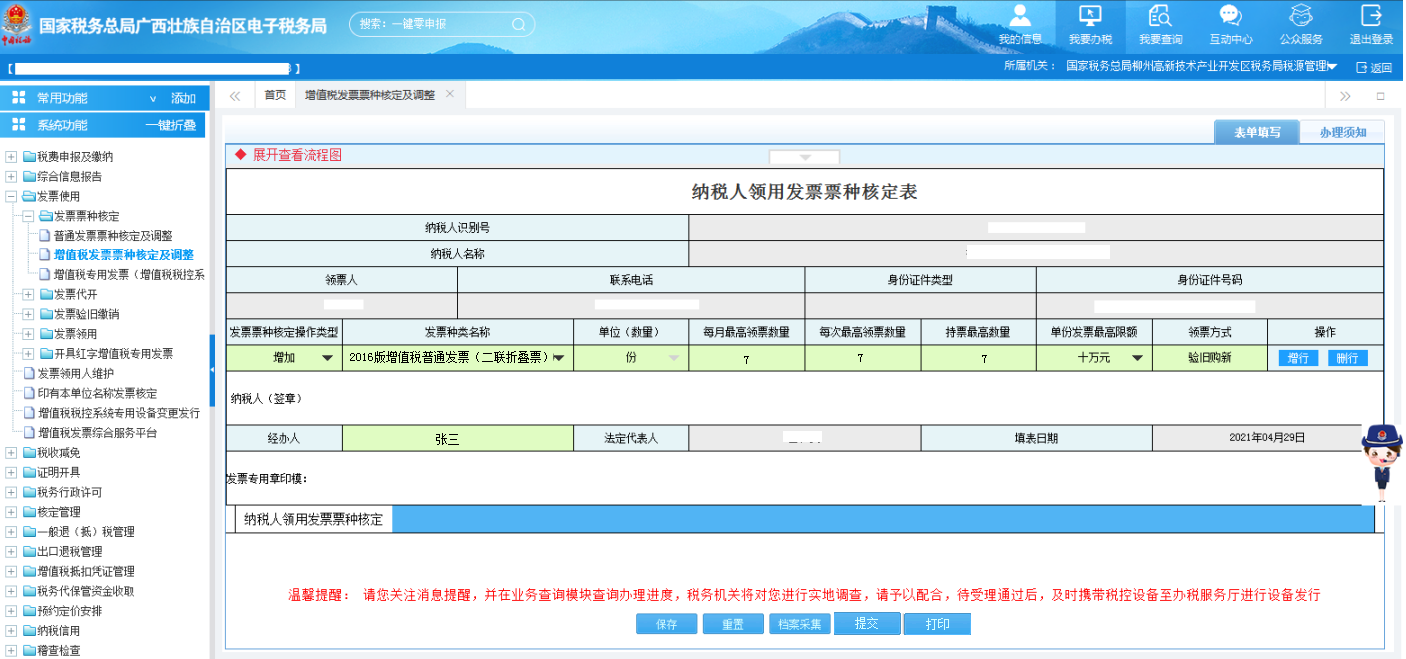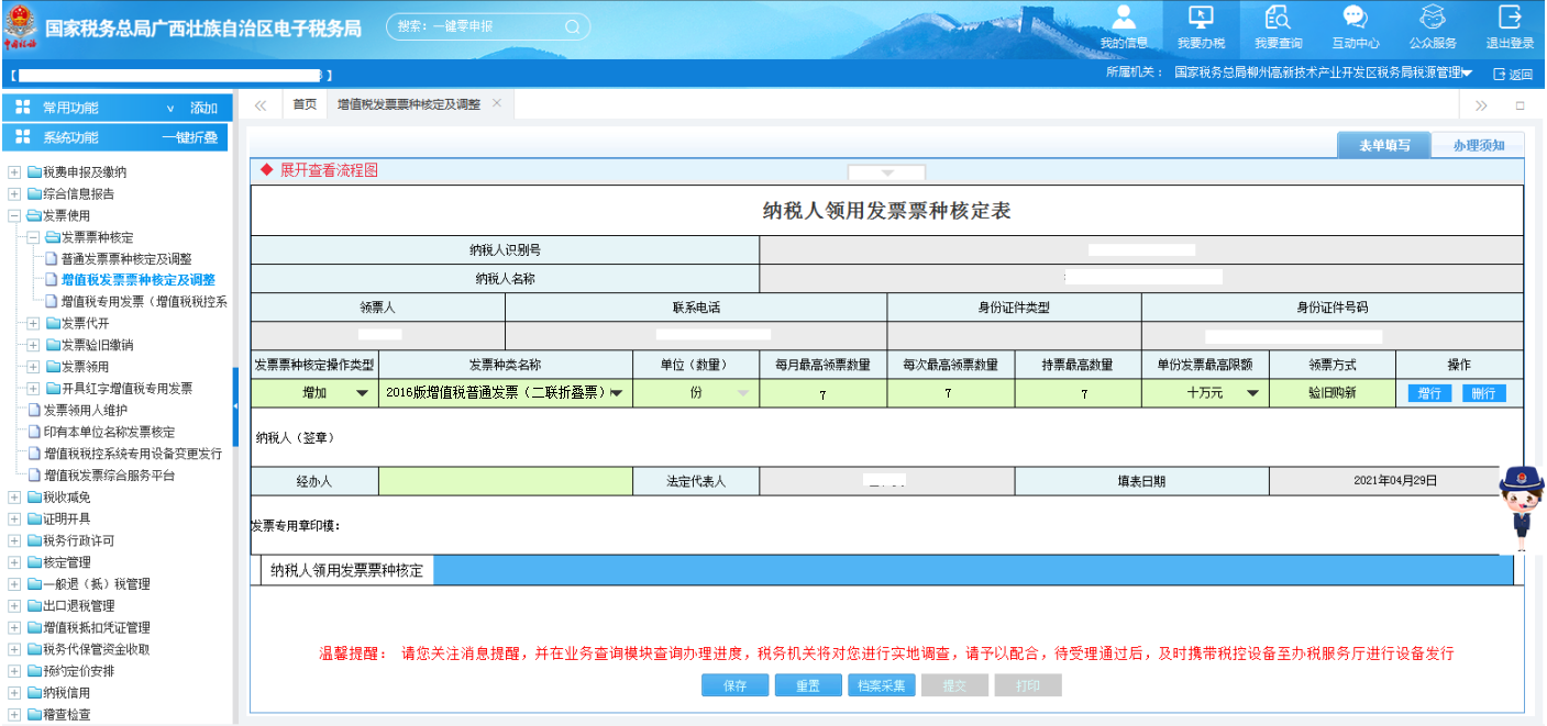 点击【我要办税】—【发票使用】—【发票票种核定】—【增值税发票票种核定及调整】,如图所示: