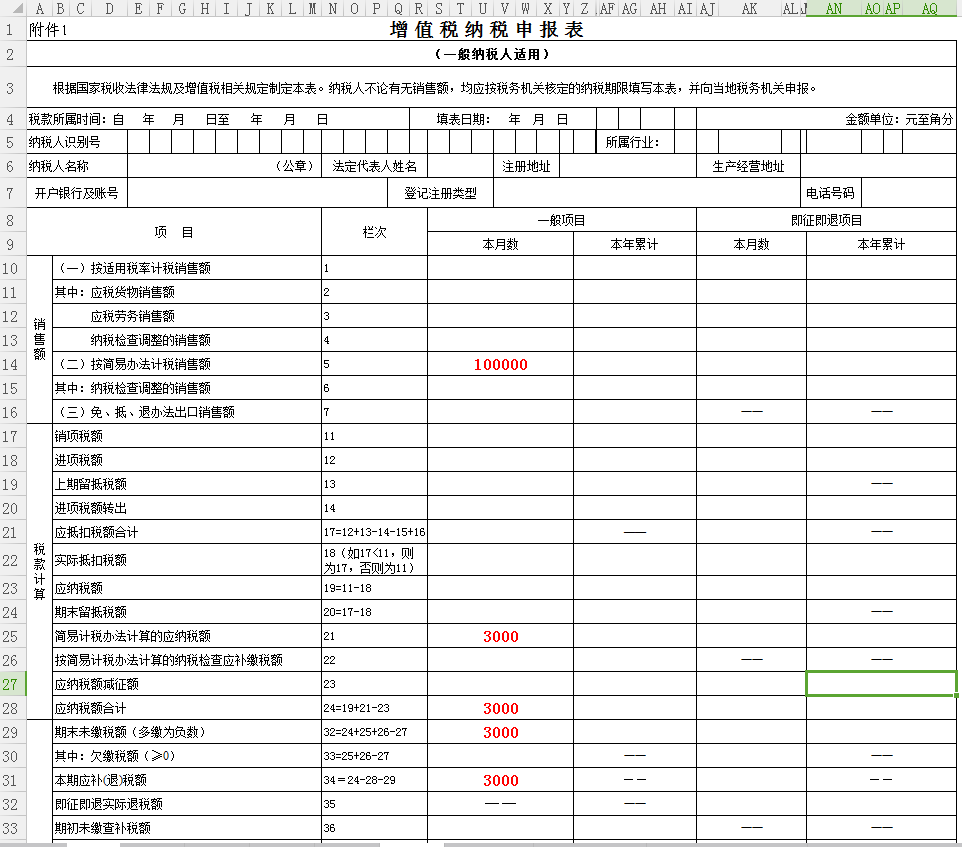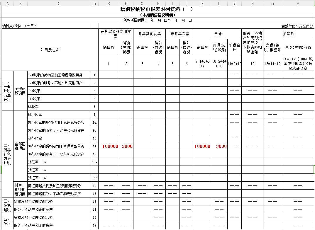某一般纳税人销售小规模纳税人期间购进的汽车取得含税销售额103000元,符合简易办法依照3%征收率减按2%征收增值税的政策,但放弃减税并开具了3%的增值税专用发票,填表如下:(不考虑其他情况)