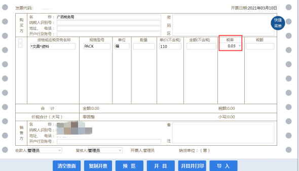 第二步:双击选择购买方信息,填写商品信息,税率栏次选择对应的征收率(3%)即可,点击【确定】。