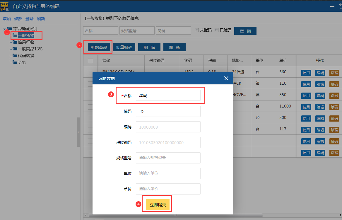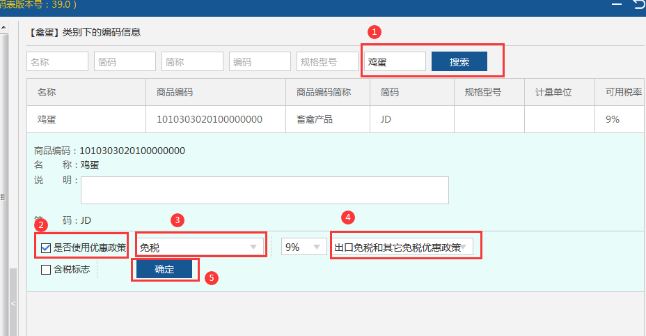 第二步:选择农产品,点击【赋码】,对所录入的农产品进行赋码及选择免税优惠,输入农产品名称,点击【搜索】选择对应的税收分类编码,勾选“是否使用优惠政策”,优惠类型选择“免税”,免税类型选择“出口免税和其他免税优惠政策”,然后点击【确定】,如下图所示: