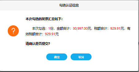 4.确认本次需要勾选的发票全部勾选完成后,点击“提交”按钮,弹出勾选认证信息对话框如下: