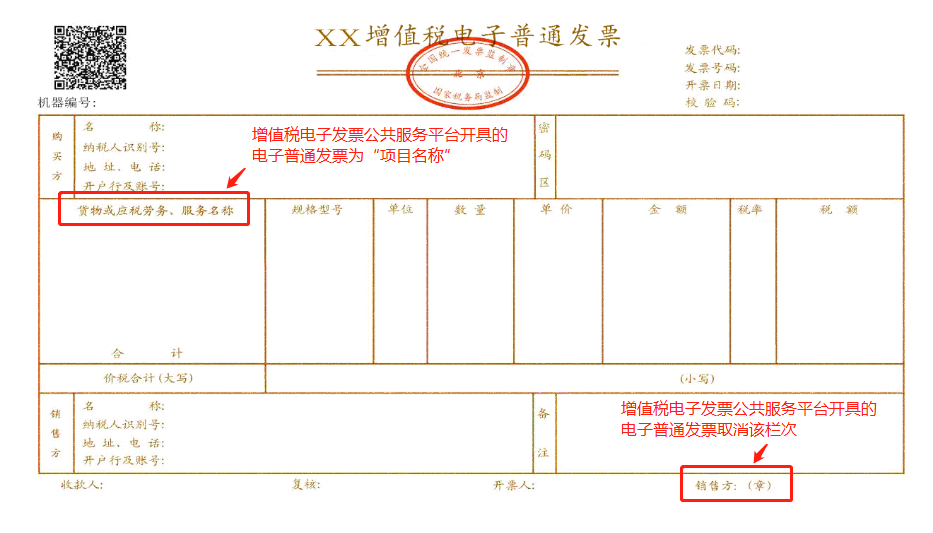 1.增值税电子专用发票将“货物或应税劳务、服务名称”栏次名称简化为“项目名称”,取消了原“销售方:(章)”栏次。