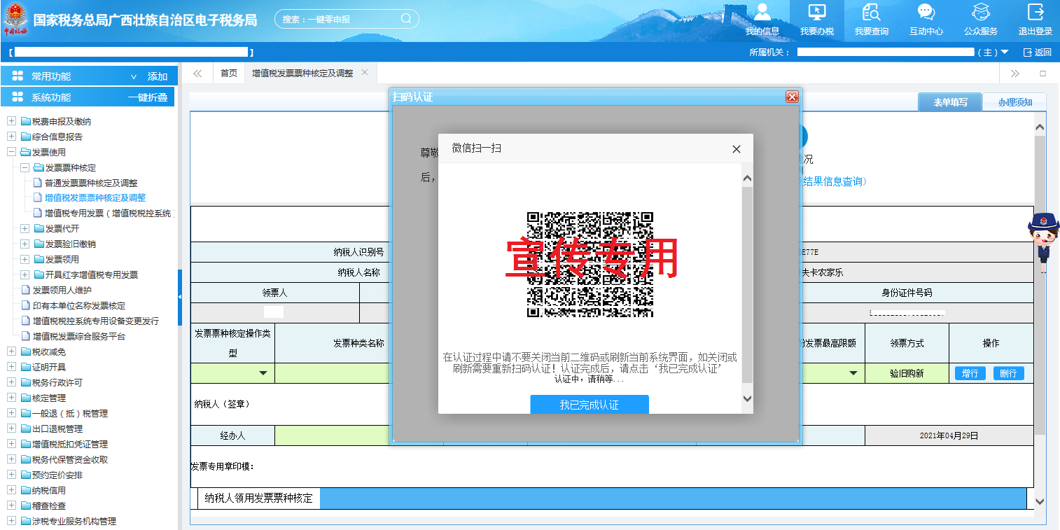 在办理业务之前,需要先进行办税人员实名认证,系统自动弹出二维码认证界面,使用手机微信扫一扫功能,扫取图中二维码进行实名认证,实名认证完成之后点击“我已完成认证”按钮,继续进行下一步业务办理,如图所示:
