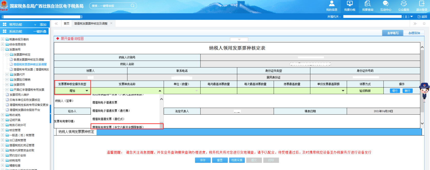 登录广西电子税务局后,点击【我要办税】—【发票使用】—【发票票种核定】—【增值税发票票种核定及调整】,如图所示: