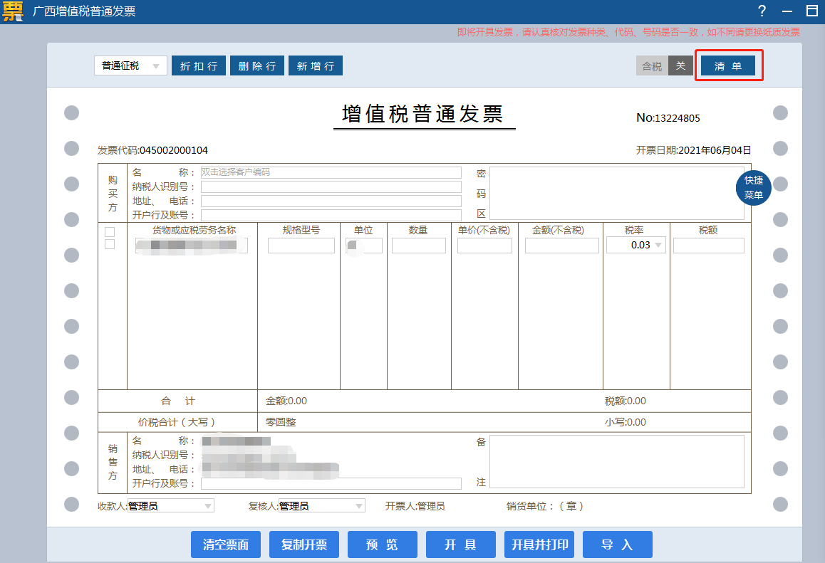 点击“发票管理/发票管理首页/发票填开/增值税专用发票”菜单项,系统弹出“增值税专用发票”窗口,征收模式默认“普通征税”,核对发票无误后进行发票开具,点击右上角的清单进行填写数据,数据填写完整后保存发票信息。