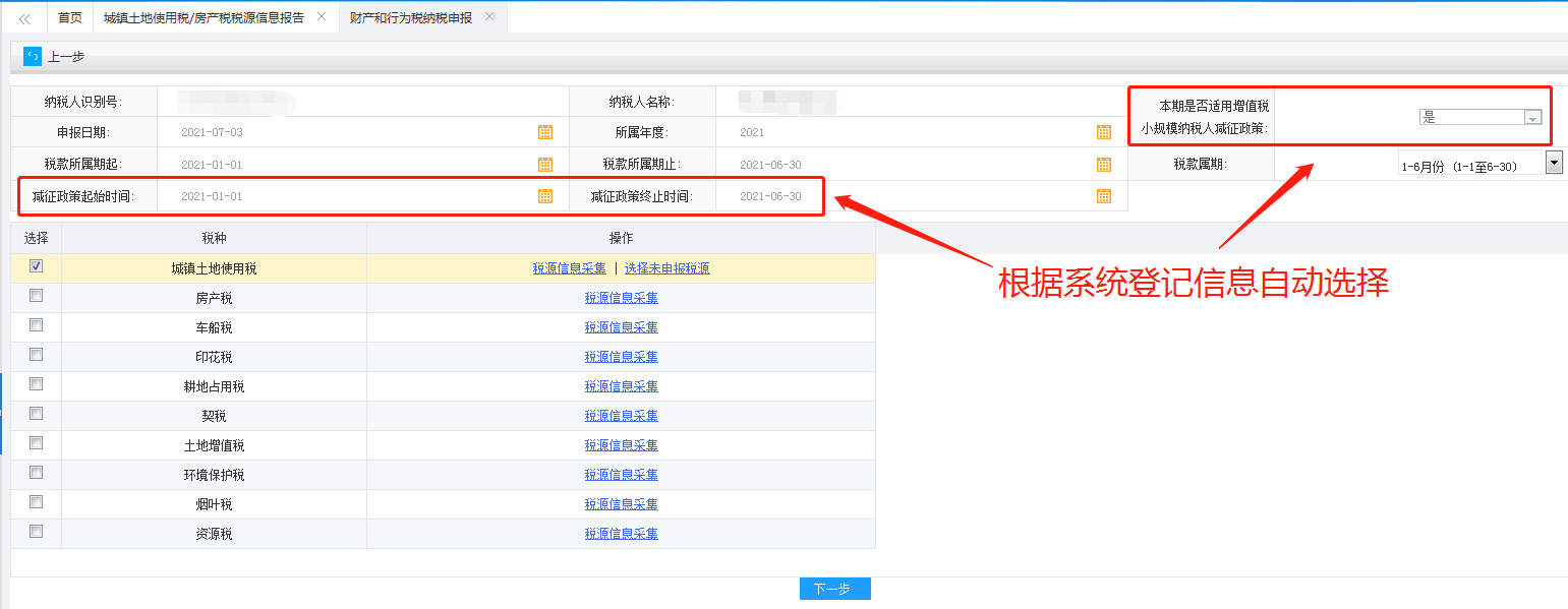 (2)电子税务局根据纳税人登记信息后台配置和自动生成数据,不需要纳税人填报,确认信息无误申报即可。其余项目根据各税种税源明细表自动生成,享受减免税申报前需填写税源明细表。