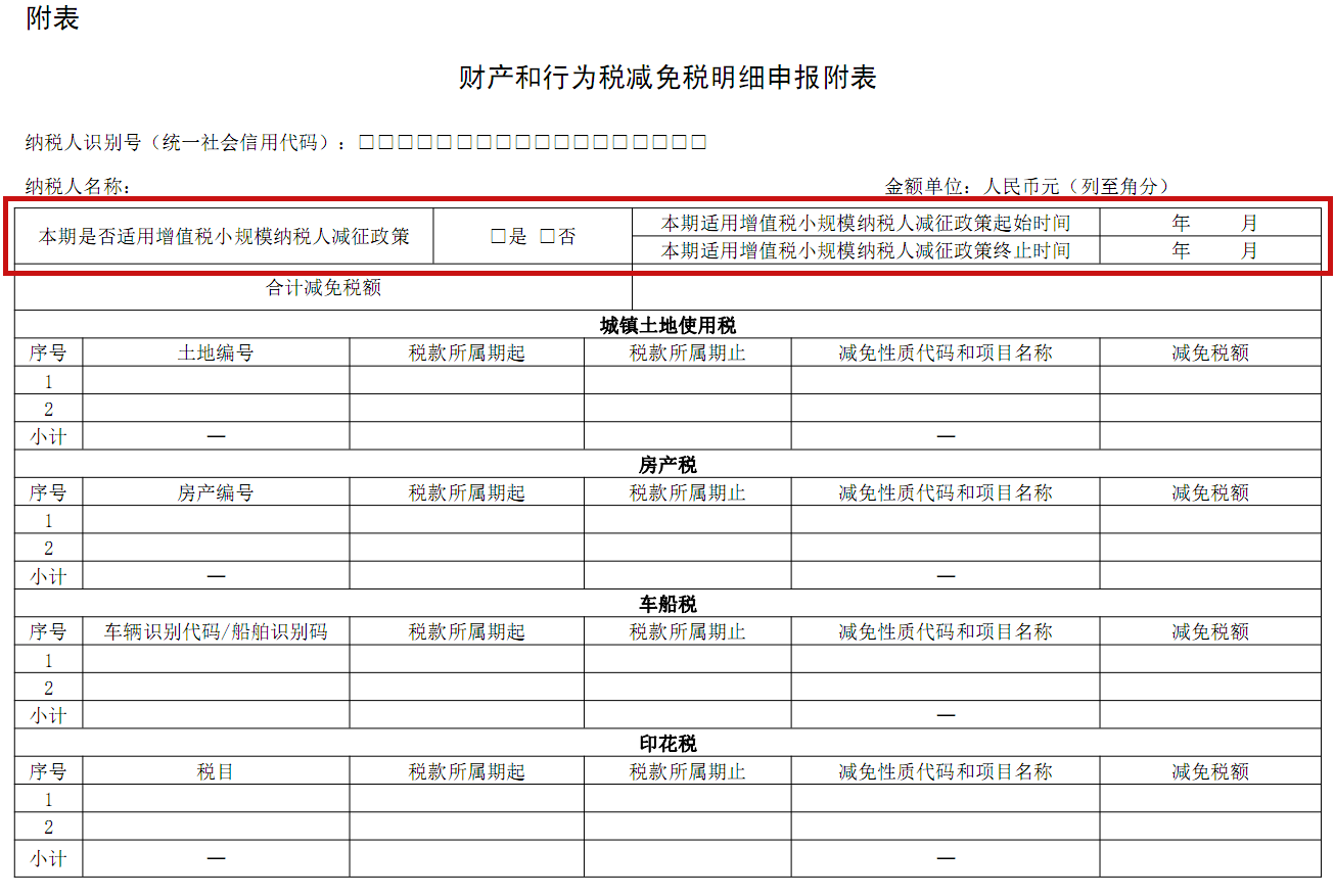 (1)自2021年6月1日起,纳税人申报缴纳房产税、城镇土地使用税时,使用《财产和行为税纳税申报表》申报。纳税人新增税源或税源变化时,需先填报《财产和行为税税源明细表》。适用增值税小规模纳税人减征政策的,需填写“本期是否适用增值税小规模纳税人减征政策”、“本期适用增值税小规模纳税人减征政策起始时间”、“本期适用增值税小规模纳税人减征政策终止时间”。