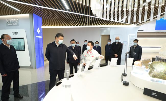 习近平随后来到广汽埃安新能源汽车股份有限公司考察。他走进企业展厅、总装车间、电池生产车间等,了解企业突破关键核心技术和推动制造业高端化、智能化、绿色化等进展情况。在广汽研究院,习近平仔细察看智能网联实验室、模型设计实验室等,并同科技人员、企业家、职工、外资企业代表等交流。习近平指出,中国改革开放政策将长久不变,永远不会自己关上开放的大门。一切愿意与我们合作共赢的国家,我们都愿意与他们相向而行,推动世界经济共同繁荣发展。习近平强调,中国是个大国,要重视实体经济,走自力更生之路。关键核心技术要立足自主研发,也欢迎国际合作。要加强教育和人才培养,夯实科技自立自强根基。